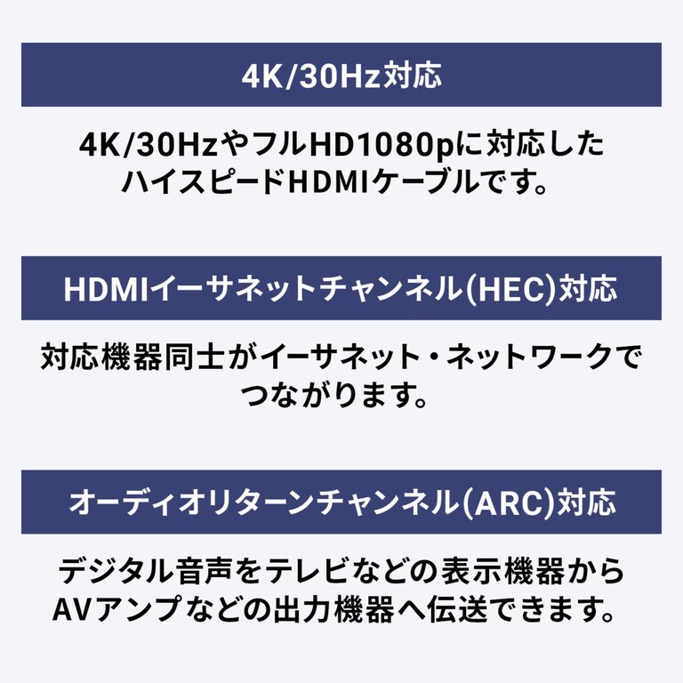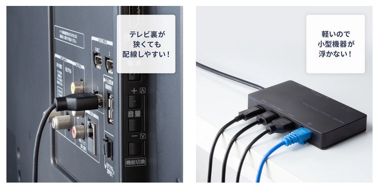 小型コネクタを採用しており、接続機器のポートにかかる負担を軽減する。テレビ裏の配線や、ハブなど小型の機器にも使いやすく便利だ。
