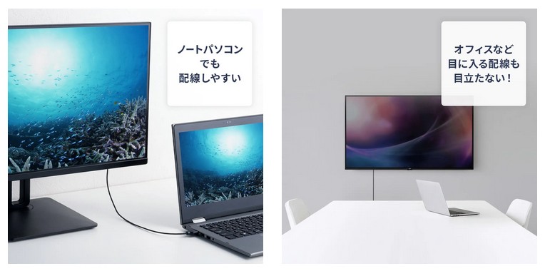 ケーブル直径が約2.8mmと細く、コネクタもコンパクトで扱いやすい極細タイプのHDMIケーブル。ノートパソコンでの使用時や、オフィスやリビングで目に入りやすい配線もスマートにできる。