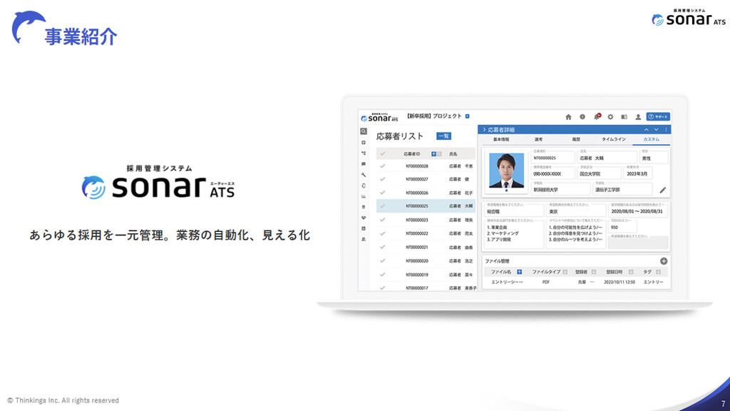 Thinkings株式会社 新規事業開発責任者の森田徹氏は、同社の事業概要および採用管理システム「sonar ATS」について説明した。