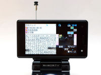 液晶画面を回転させると自動的にテレビが起動する。便利なのはマルチウィンドウ機能がついているってこと。テレビを見ながらほかの機能を起動することができるのだ。単に起動してバックグラウンドでどうのこうのって訳じゃなく、画面が左右ふたつに分かれてテレビとその他の機能が使えるのである。受信したメールを見ながらテレビを見たり、メールを作成しながら見たりすることもできる。そのほか、スケジュールやToDoリスト、電話帳、ブックリーダー、ドキュメントビューア、電卓、テキストメモなどが、テレビと同時に使用できる。これはかなり便利である。SoftBankの911SHにはついていない機能だ。