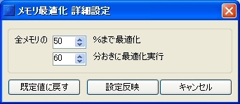 次にメモリの最適化だが、これは初期設定で60分おきに自動的に実行されるようになっている。手動で行いたい場合は、[メモリ最適化]の[今すぐ実行]をクリックすればいい。また、[詳細設定]をクリックすれば、メモリの何%までを何分おきに最適化するかを設定することもできる(画面4)。自動で実行したくない場合は、[自動実行]で[無効]を選択しておこう。