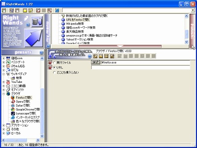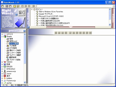 RightWandsの操作は実に簡単だ。追加できる機能はあらかじめ「プリセット」として登録されており、画面の左側の「presets」に一覧表示されている。まずはここから追加したい機能を選択し、左上の矢印のアイコンをクリックする(画面2)。ここではGoogleのイメージ検索を選択してみた。