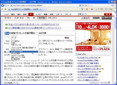 それでは、実際に機能が追加されているかどうか試してみよう。Internet Explorerを起動し、検索したい単語を選択した状態で右クリックすると、追加した機能がメニューの中に表示されている(画面5)。選択すれば機能を実行できるというわけだ。