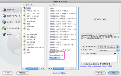 この拡張機能は、iPhone用Webサイトの作成支援機能を追加するもので、インストールすると、新規作成メニューから「iPad用ページ」「iPhone用Webアプリ」「iPhone用ページ」のHTML・CSSテンプレートが選択できるようになります。これを使えば、Dreamweaverでも簡単にiPhoneに特化したサイトがつくれるようになります。