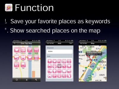 駅などあらゆるキーワードに対応しています。余計な機能は一切なく、お気に入りの場所をすぐに見つけることだけに特化したアプリです。こちらは現在、App Storeに申請中です。
