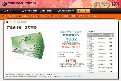 「ワールドカップでの経験で、ある程度は予想していましたが、8月に入るなり、3万円分のJTB旅行券が232円とか、さらにお盆シーズンは予想以上に盛り上がらず、毎日背筋が凍る結果となってしまいました。具体的にはPS3などの商品が16円で落札とかは、本当にきついです。。。参加人数が少ないため、1度落札経験された方が他の商品も落札して複数落札の方が増えたのも運営側としては悩ましい状態です。もう開き直るしかないと途中から達観してしまいました。。。」