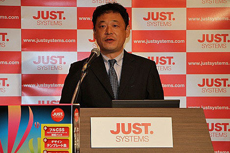発表会は、ジャストシステム 代表取締役社長 福良 伴昭 氏からの挨拶から始まった。