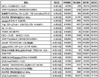 10月上旬までに落札された商品をみると、ゼニーパックやamazonギフトカードなどの金券系、黒毛和牛焼肉セットなどの食品系は好転しているものの、家電系となると、PS3本体が199円をはじめ、SONY PSPが129円、SHARP プラズマクラスターイオン発生機が44円など、子供のお小遣いのような落札価格となっている。