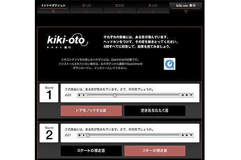 また体験型のコンテンツとして、「kiki-oto番付」を用意。手持ちのヘッドホンで音楽の中に潜んだ音に関する問題が出題され、音楽の楽しみ度合を診断することができる。また、楽しみ度合の結果(番付)をユーザーのTwitterアカウントのタイムライン上にツイートさせることも可能だ。