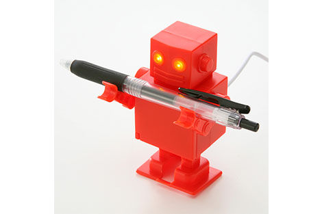 「USBハブロボット」は、お腹のカバーを開くと2ポートのUSBポートを備えており、通電時には目が光る。不足しているUSBポートを補うUSBハブとして便利に使うことができる。