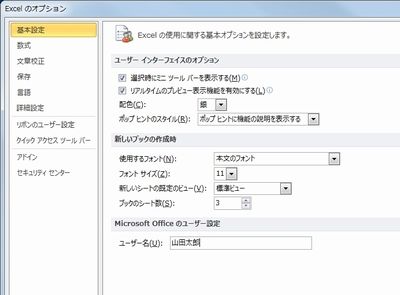 | 画面7 [ファイル]タブの[オプション]をクリック。[基本設定]の[ユーザー名]を変更しよう。 |