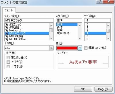 | 画面10 [コメントの書式設定]ダイアログボックスで、文字サイズを拡大、文字色で赤を選択している。設定したら[OK]ボタンをクリック。 |