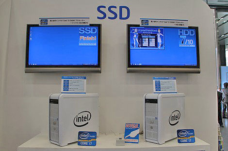 さらにSSDのコーナーでは、第2世代インテル Core i7-2600Kプロセッサーを使い、インテル SSD搭載の最新パソコン vs ハードディスク搭載パソコンの対決を行っていた。