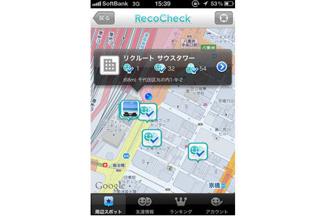 「RecoCheck」の最大の魅力は、リクルートが持っている膨大なスポット情報が予め登録されている点だ。「RecoCheck」を起動すると、今いる場所からオススメのスポットを一覧で表示してくれるので、自分がよく行く場所や友だちのよく行く場所がすぐに確認することができる。