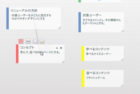 貼り付けたリーフは、ドラッグ&ドロップで移動できる。書き込んだ内容で分類して、関連するリーフを近くに置くなどすれば、アイデアを整理しやすい(画面7、画面8)。