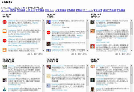 JR東日本、都営線、西武鉄道、小田急線、京王電鉄、東京メトロ、JR東海道線、東急電鉄、新幹線、モノレール、東武鉄道、横浜市交通局、京急電鉄のリアルタムなツイートを確認することができる。