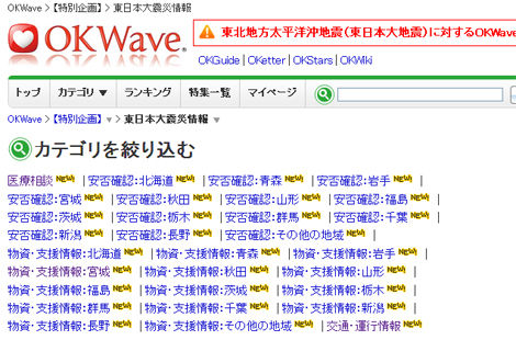 OKWaveは東北地方太平洋沖地震に対する取り組みとして、Q&Aサービスを通じて、被災者が必要としている、安否、被災地での給水・炊き出し、物資、交通といった情報交換の場を提供している。