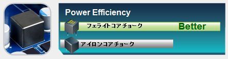 チョークとは、電流を整え、電力を蓄える役割をもつ「誘導子」のことだ。フェライトコアチョークは、下記のグラフからわかるとおり、従来の鉄製チョークに比べてさびにくく、電源効率も高いものとなっている。