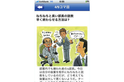 「社内政治学科」「オトナ語学科」「処世術学科」「女ゴコロ学科」「環境トラブル学科」「接待学科」「あなたの成績」といった具合に6つのシチュエーションに分かれておりビジネス会話が学べます!!