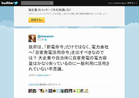 東日本大震災にともなう原発事故に対して、ソフトバンクの創設者である孫正義氏は、Twitterを通じて活発な発言をしている。そんな孫正義氏が政府につぶやいた発言に対して、Twitterユーザーから様々な声が寄せられている。