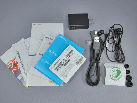 付属品を並べてみた。ドコモが「新感覚エンターテイメントマシン」というだけあり、ステレオイヤフォンやマイク付イヤホンも付属されている。