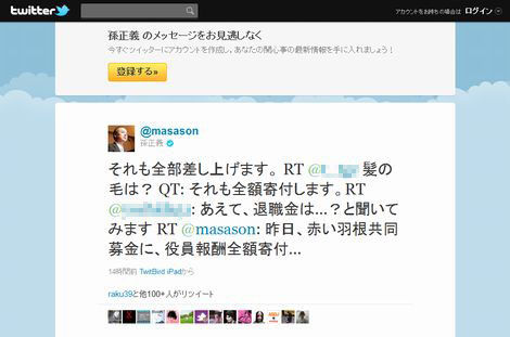 髪の毛まで差し出すという孫正義氏の発言は、Twitter読者に感動を与えたようだ。同氏の行動に今しばらくは目を離せそうにない。