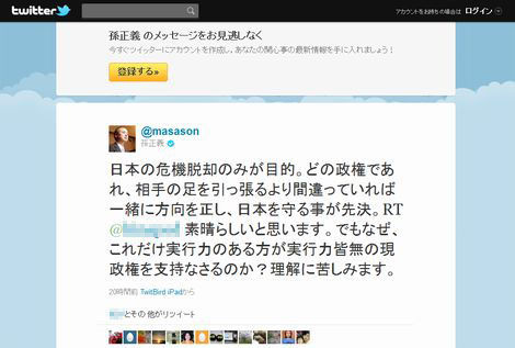 東日本大震災にともなう原発事故以来、ソフトバンクの創設者である孫正義氏は、Twitterを通じて活発な発言をしている。そんな同氏が、現政権を支持する理由を明らかにした。