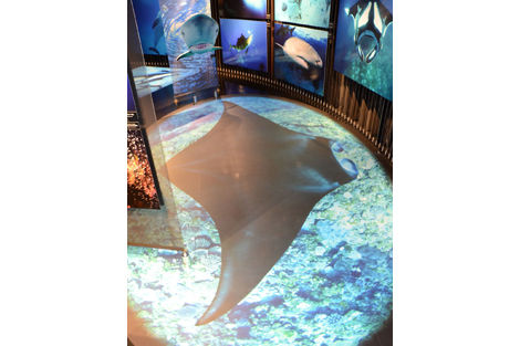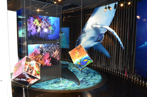 影から見え隠れするサメや、まるでこっちを向いて「にらめっこ」しているような、子供の目線にあわせた熱帯魚たち、天井をゆったり泳いで行くウミガメ、その巨大さが分かるように床に展示されたマンタなど、大人から子供まで楽しめるような遊び心が満載している。水中写真家・越智隆治氏の写真が、RING CUBEの全面に飾られ、まるで水中散歩をしているかのような気分になる。