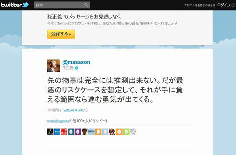 ソフトバンクグループの代表 孫正義氏は、東日本大震災にともなう原発事故以来、Twitterを通じて活発な発言をしている。そんな同氏の格言的な発言が話題となっている。