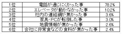 | 表1.東日本大震災の直後、会社で最も不便だった事は何ですか?(対象:500 名) |