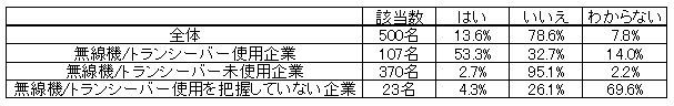 | 表2.あなたの会社では、業務で無線機/トランシーバーを使用していますか?(対象:500 名) |
