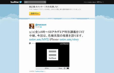 孫正義氏は、「9/2(金)18時~SBアカデミア特別講義をUST中継。今回は、危機克服の極意を語ります。 http://ustre.am/bNTj iPhone http://ustre.am/etwy」と、自身のTwitterでつぶやいた。