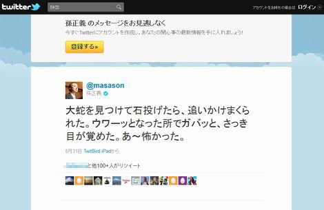 孫正義氏は、「大蛇を見つけて石投げたら、追いかけまくられた。ウワーッとなった所でガバッと、さっき目が覚めた。あ~怖かった。」と、自身のTwitterでつぶやいた。