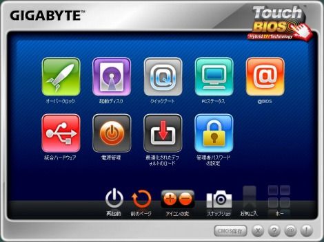 そのほかの特長としては、Intel Smart Response Technologyの導入を簡単に行えるGIGABYTE独自機能「EZ Smart Response」や、GIGABYTE「Touch BIOS」にも対応している。これは、Windows上で簡単にCPUの電圧、倍率設定やステータスの確認、PCの各種設定が行えるユーティリティ。グラフィカルなアイコンで表示される設定項目は誰にでもわかりやすく、システム変更もインターラクティブに行えるのだ。