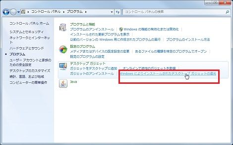 | 画面1 初期から入っていたガジェットを復元したいなら、スタートメニューからコントロールパネルを起動。[プログラム]→[Windowsによりインストールされたデスクトップガジェットの復元]を選択する。 |