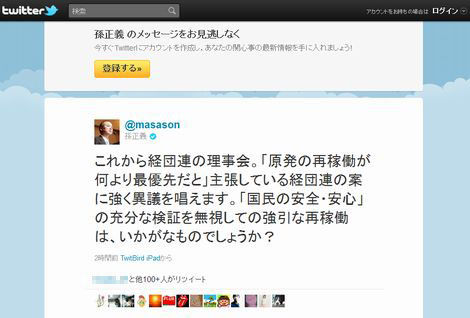 ソフトバンクグループの代表 孫正義氏は、東日本大震災にともなう原発事故以来、Twitterを通じて活発な発言をしている。そんな同氏の発言に、多くのコメントが寄せられている。