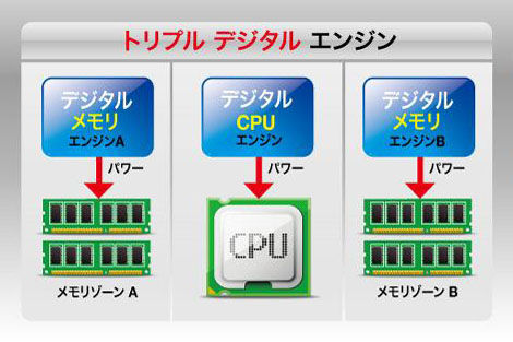 GIGABYTE X79シリーズ・マザーボードは、CPUおよびメモリに3つのデジタルPWMコントローラーを搭載した「トリプルデジタル エンジン」技術を採用し、かつてないほど高効率な電源供給コントロールを可能にしている。