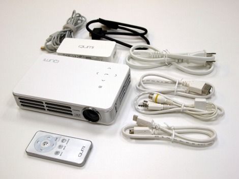 付属品は、ACアダプター、VGAケーブル, ミニHDMI←→HDMI ケーブル, ミニHDMI←→ミニHDMIケーブル, RCA端子AVケーブル3ピン(メス), Qum収納ポーチ, リモコン,と、パソコンからAndroid端末(HDMI出力対応機種)まで標準で対応できるケーブルが同梱されている。(iPhone/,iPad用ケーブルは別売り)