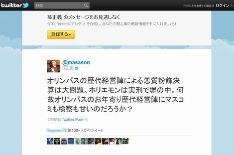 「オリンパスの歴代経営陣による悪質粉飾決算は大問題。ホリエモンは実刑で塀の中。何故オリンパスのお年寄り歴代経営陣にマスコミも検察も甘いのだろうか?」と、つぶやいた。