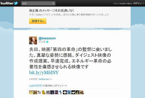 「先日、映画「第四の革命」の監督に会いました。真摯な姿勢に感銘。ダイジェスト映像の作成提案。早速完成。エネルギー革命の必要性を痛感させられる映像です http://bit.ly/yMfdNY」と、つぶやいた。