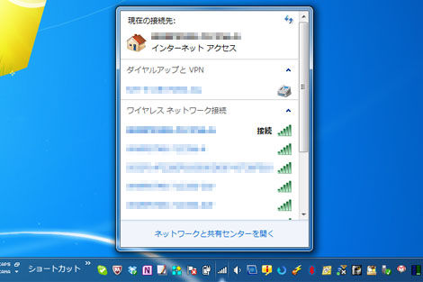 タスクトレイにある無線LANのアイコンをクリックしたのち、「WN-G150TR」の「SSID1」を選択して、「接続」ボタンを押す。
