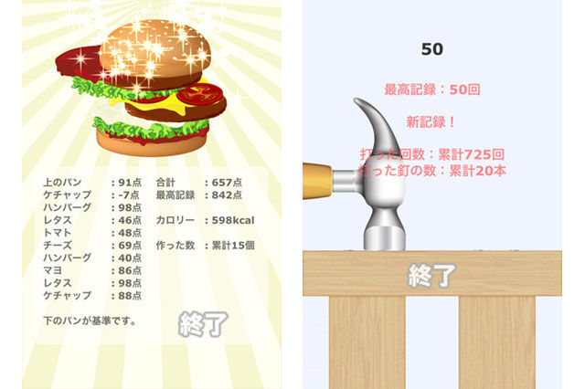 | 25万ダウンロードの「バーガー職人」(左)と「釘打ち名人」(右) |