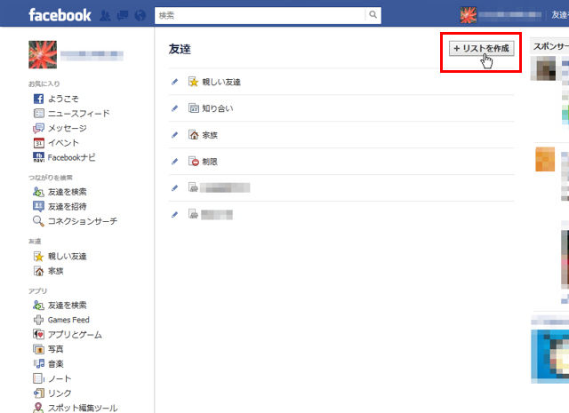 すべてのメンバーを入力したら、[作成]をクリックすれば登録は完了だ。ニュースフィードの[友達]欄に新しく作成したリスト名が表示される(画面4)。これをクリックすることで、そのリストに登録している友達の投稿だけを絞り込んで表示することができる。