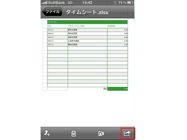 | 画面3 Excelファイルを開いた。再現性はかなり高い。右下のボタンをタップすると編集メニューが開く。 |
