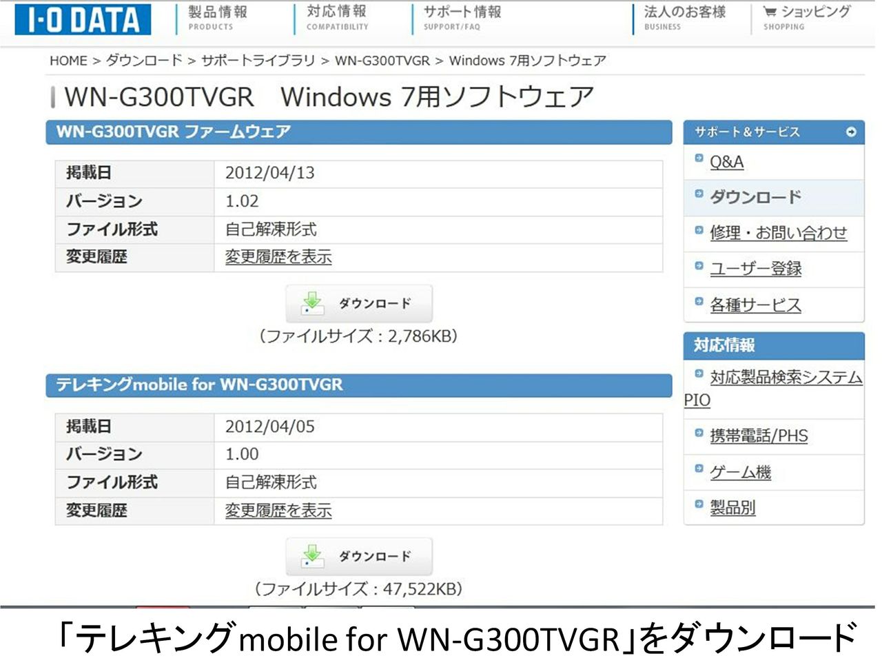 I-O DATA のサポートライブラリから「テレキングmobile」をダウンロードする。