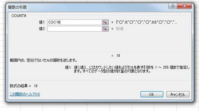 | 画像3 アクティブセルに「=COUNTA(C2C:16)」の数式が挿入され、「○」を入力したセルの数が「10」と表示された。 |