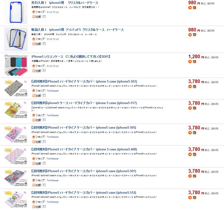 試しに楽天で「iPhone 5 ケース」というキーワードで検索を行うと、原稿執筆時で55件が検索された。980円から4千円弱のハードカバーまで種類が豊富だ。その商品ページに行ってみると、何と購入が可能である。製品登場前に税込3,780円を出して購入するヤツはいるのか? という疑問はあるがとにかく、誰よりも何よりも製品がリリースされる前にiPhone 5用カバーを入手したい人は、自己責任で購入してみるといいだろう。
