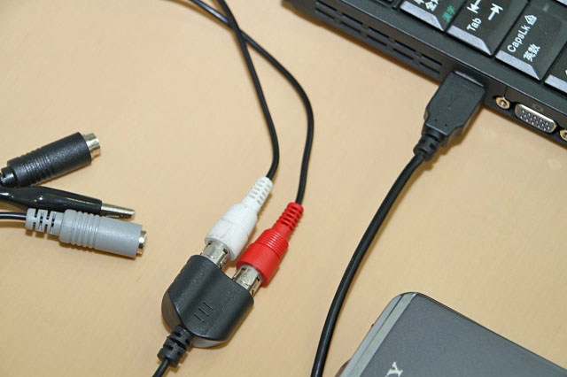 | 「AD-USB」に音声ケーブルを繋げたら、パソコンのUSB端子に接続する |