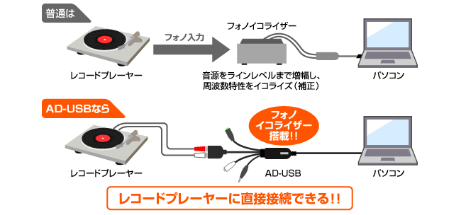 通常レコードプレーヤーから直接パソコンに接続して録音しようとすると、CDに比べて約1/1000程度のとても小さな音量で録音されてしまう。