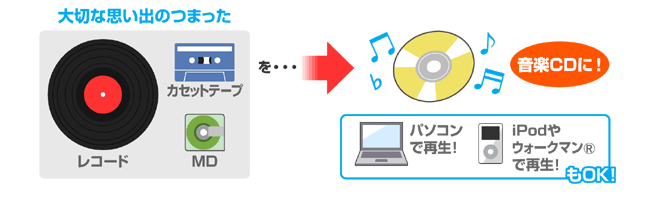 たったこれだけで、パソコンで再生したり、iPodやウォークマンで聴いたり、音楽CDを作成できるのだ。